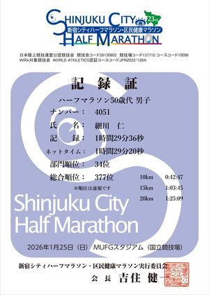 1月25日、新宿シティハーフマラソンを走ってきました。真冬の朝の新宿は空気がキンと冷えていて、スタート前に立っているだけで体温を奪われていく感覚があり、整列中はビニールかっぱを2枚重ねにしてなんとか寒さをしのいでいました。ただこの大会は、スタート直前まで上着を着たままでいられ、出走直前に回収し、ゴール後にはブロックごとにまとめて返却してくれる仕組みだったようで、それを知っていれば上着を持ってくればよかったと少し後悔。ゼッケン管理ではないため取り違えの可能性もあり、次回は失くしても問題ないジャージを着てこようと思います。